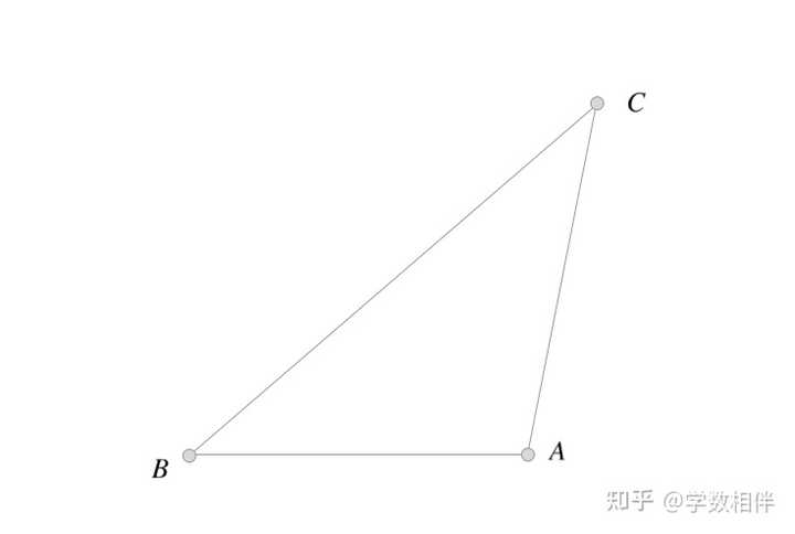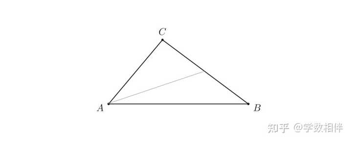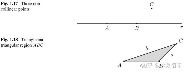 对顶角 命题1.9: 对顶角相等(Two opposite angles have equal measures)。 证明: \alpha + \gamma = 180^\circ = \beta + \gamma ,于是得到 \alpha = \beta 。 1.3 凸多边形(convex polygons)6. 共线和三角形 共线(collinear): 平面内三点 A,B,C , 如果 C\in \stackrel{\leftrightarrow}{AB} , 则说这三个点共线。 三角形(triangle): 平面内不共线的三个点 A,B,C 构成一个三角形。此时称这三个点为三角形的顶点(vertices);线段 AB, BC, CA 叫做三角形的三条边(sides, edges)。 三角区域(triangular region)对应于三角形 ABC 。 |