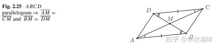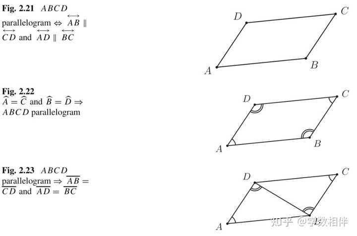 例2.28: 如图2.20, 使用尺规作图找一个点 P\in r 使得 \overline{PA} + \overline{PB} 尽可能的小。 传说亚历山大城有一位精通数学和物理的学者,名叫海伦。一天,一位罗马将军专程去拜访他,向他请教一个百思不得其解的问题:从A地出发到河边饮马,然后再到B地,求怎样走使路线最短,并且求如何确定饮马的地点。提起路线最短的问题。将军每天从军营A出发,先到河边饮马,然后再去河岸同侧的B地开会,求怎样走才能使路程最短。这个问题的解决并不难,据说海伦略加思索就解决了它. 从此,这个被称为“将军饮马”的问题广泛流传. 解: 用尺规作图标记出点 A 关于直线 r 的对称点 A^\prime 。我们要求的是 \overline{PA} + \overline{PB} 的最小值问题。 而 \overline{PA} = \overline{PA^\prime} , 因此问题转换为求 \overline{PA^\prime} + \overline{PB} 的最小值问题。 对于定点 A^\prime, B 来说,连接两点的直线段距离最短(三角不等式的结论)。连线与直线 r 的交点 Q 即为所求。 2.5 特殊四边形(special quadrilaterals) 在本节中,我们开始对凸四边形的几何进行系统研究。在各种特殊的凸四边形类型中,最主要的肯定是平行四边形。 26. 平行四边形(parallelogram) 定义2.9: 两组对边都平行的凸四边形称为平行四边形。 稍后我们将讨论一些定义平行四边形的等价方法。我们需要将这些结论视为平行四边形的显著特性,后面我们会反复使用它们。 27. 平行四边形等价定义 |
