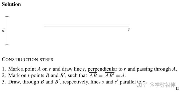 以 A 为圆心,绘制一个圆交直线 r 于点 B,C 。然后分别以 B, C 为圆心绘制半径为 \frac{1}{2}\overline{BC}">R > \frac{1}{2}\overline{BC} 的两个圆,取这两个圆的两个交点之一 A^\prime , 则直线 \overleftrightarrow{AA^\prime}\perp r 即为所求。 同样可以通过 SSS 来验证。 2.8 绘制平行线(1) |
