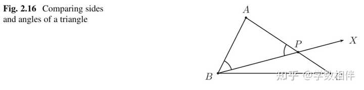 证明: 因为 \widehat{C} ">\widehat{B} > \widehat{C} ,那么可以可以从 B 点画一条射线 \overrightarrow{BX} , 让该射线穿过三角形 ABC 内部,并且满足 \begin{aligned}\widehat{CBX} =\frac{1}{2}(\widehat{B} - \widehat{C})\end{aligned}\\ 并设这条射线与 AC 交于点 P 。 则有 \begin{aligned} \widehat{APB} &=\widehat{CPB} + \widehat{C} \\&=\frac{1}{2}(\widehat{B} - \widehat{C}) + \widehat{C} \\&=\frac{1}{2}(\widehat{B} + \widehat{C}) \end{aligned}\\ 而 \begin{aligned} \widehat{ABP} &=\widehat{B} - \widehat{CBX} \\&=\widehat{C}+\frac{1}{2}(\widehat{B} - \widehat{C}) \\&=\frac{1}{2}(\widehat{B} + \widehat{C}) \end{aligned}\\ 因此得到 \begin{aligned} \widehat{APB} = \widehat{ABP} \end{aligned}\\ 三角形 ABP 为等腰三角形, ABC 中 \widehat{A} \geq 90^\circ , 那么 \overline{BC} 是最大边。特别的,在直角三角形中,斜边是最大边。 证明: 因为 \widehat{A} \geq 90^\circ ,根据三角形内角和为180度,足以说明 \angle A 为最大角,因此它所对的边为最大边。# 推论2.25: 两个三角形如果两对边对应相等,则这两组边所夹角越大,所对的对边长越长。 设 ABC, A^\prime B^\prime C^\prime 为两个三角形,其中 \overline{AB} = \overline{A^\prime B^\prime} , \overline{AC} = \overline{A^\prime C^\prime} , 如果 \widehat{BAC} < \widehat{B^\prime A^\prime C^\prime} , 则 \overline{BC} < \overline{B^\prime C^\prime} 。 |