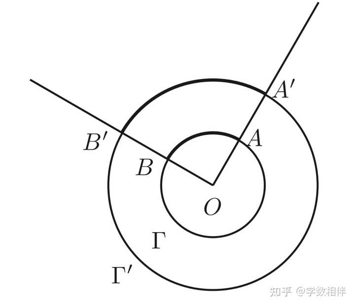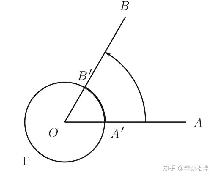 度数概念的良好定义 公理: 同样的两条以 O 为端点的射线隔两个圆得到的两个弧度数相等 \overset{\LARGE{\frown}}{AB} = \overset{\LARGE{\frown}}{A^\prime B^\prime} 。 根据度的定义: 完整圆对应于 360^\circ 。 接下来还有一个问题: 如何度量任意给定的角 \angle AOB 呢? |