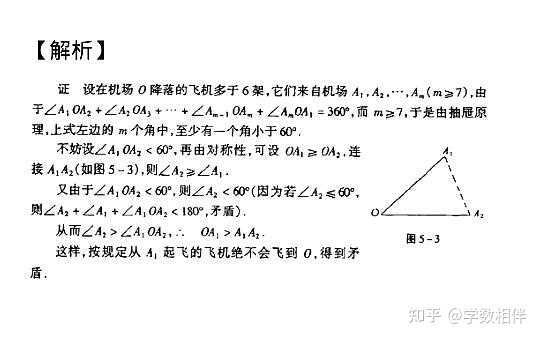 证明: 若从城市 B,C 出发的飞机都降落到 A 城市,我们根据题意知道 \widehat{BAC} > 60^\circ , 考虑城市 A , 那么降落到 A 城市的飞机数量不能超过6,否则就得到矛盾。圆周角为 360^\circ 。 |