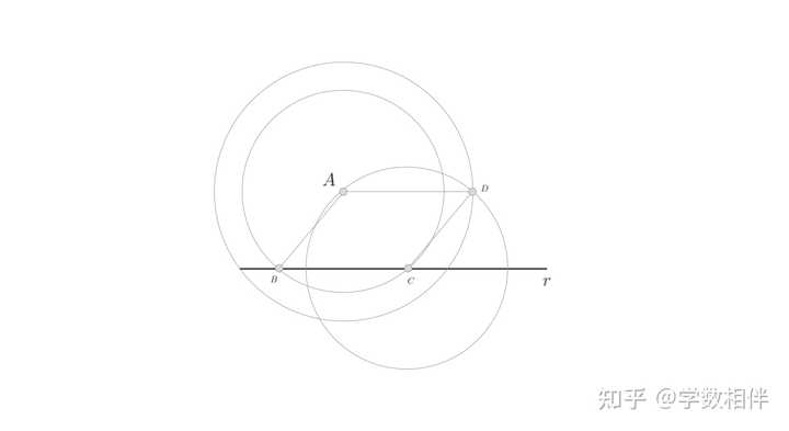证明上述操作是正确的,我们可以使用反证法,假设 AY, r 相交于一点 B 。 那么我们考虑 C\in BX 的情形( B\in CX, X\in BC 的情形类似)。 通过构造过程,我们知道 \widehat{BAC} = \widehat{YAC}= \widehat{ACX} 。 另外,因为 \angle ACX 是三角形 ABC 的一个外角,因此就有 r 和直线外一点 A\not\in r , 使用尺规作图绘制过点 A 且平行于 r 的直线。 |