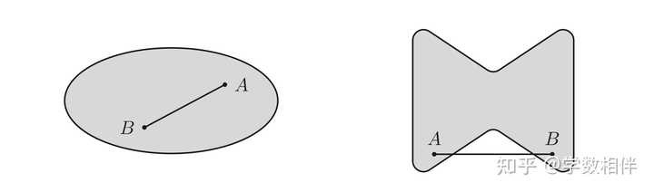 凸区域 非凸区域 非凸区域至少可以找到两个点 A,B\in \mathcal{R} : AB\not\subset \mathcal{R} 。 直线界限的闭合半平面(closed half-planes bounded by r): 平面的任意一条直线 r 将平面分为两个凸区域,称为直线 r 界限的闭合半平面(closed half-planes bounded by r)。 说明: 直线 r 可以被看成含在两个半平面中的任何一个中。若在两个半平面中分别选定一个点 A,B ,则必然有 AB\bigcap r \neq\emptyset ,也就是 AB 直线与界限必然相交。 |