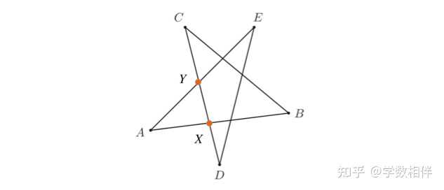 10) 如下图所示,计算五角星的五个顶点 A,B,C,D,E 所对应角度数之和。 |
