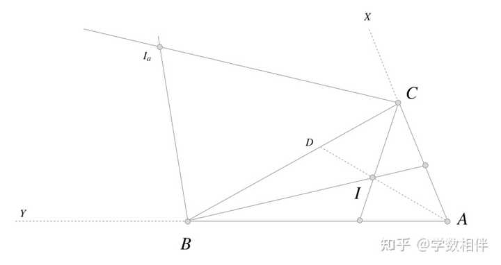 说明: 连接 AI 并延长交 BC 于 D 点。然后 \widehat{BIC} = \widehat{BID} + \widehat{CID} , 则由外角定理得到 \widehat{DIC}= \frac{1}{2}\widehat{ACB} + \widehat{CAB}, \widehat{DIB}= \frac{1}{2}\widehat{ABC} + \widehat{CAB}\\ 整理即得证。 14) \Delta ABC , I 为内心,即三条内角平分线的交点。若 \begin{aligned}\widehat{A} = \frac{1}{8} \widehat{BIC}\end{aligned} , 求 \widehat{A} 。参考上题结论和图。 15) \Delta ABC , I_a 为旁心(excenter相对于顶点 B,C 的外角平分线交点), 求证 \begin{aligned}\widehat{BI_aC} = 90^\circ - \frac{1}{2}\widehat{BAC}\end{aligned} |