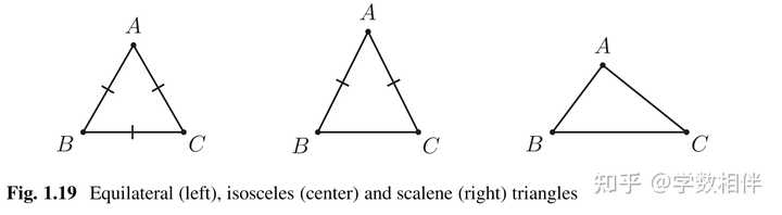 通常来说,如果不产生混淆的话,我们直接用三角形的三边长度做为它们对应的边,通常记号如上图所示 \overline{AB} = c,\overline{AC} = b,\overline{BC} = a 。 周长(perimeter): 三角形的三边长度之和称为三角形的周长。通常我们使用 p 表示半周长(semiperimeter) \bbox[10pt,border:1pt]{\begin{aligned}p = \frac{a+b+c}{2}\end{aligned}}\tag{1.1}\\ 三角形内角(interior angles): \angle A= \angle BAC, \angle B= \angle ABC, \angle C= \angle ACB , 或者 \widehat{A} = \widehat{BAC}, \widehat{B} = \widehat{ABC}, \widehat{C} = \widehat{BCA} 称为三角形的内角。 三角形的常见分类方法 按边长度来分类: 按照至少两边相等、任意两边都不相等来分类, 分为等腰三角形和不等边三角形。按内角的度量来分类: 按照最大角的度数是钝角、直角还是锐角来分。 定义1.10: 对于三角形 ABC 来说 等边三角形(equilateral): 如果 \overline{AB} = \overline{BC} = \overline{AC} , 则三角形 ABC 为等边三角形。 等腰三角形(isosceles): 如果 \overline{AB}, \overline{BC} ,\overline{AC} 至少有两个相等 , 则三角形 ABC 为等腰三角形。 不等边三角形(scalene): 如果 \overline{AB} \neq \overline{BC} \neq \overline{AC}\neq \overline{AB} ,则三角形 ABC 为不等边三角形。 注意: 等边三角形也是等腰三角形;但等腰三角形不一定是等边三角形。 |