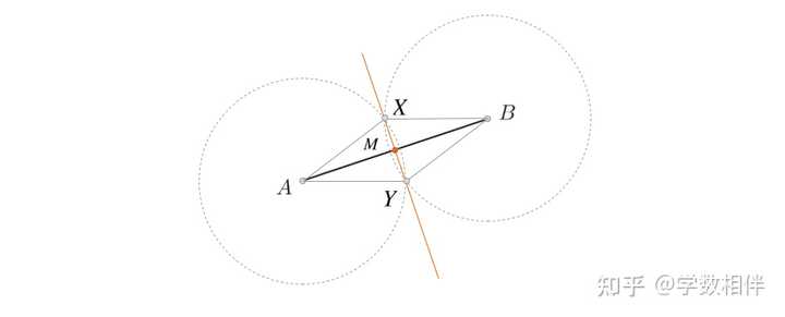 取一个长度 \frac{1}{2}\overline{AB}">r > \frac{1}{2}\overline{AB} , 分别以端点 A,B , 半径为 r 绘制两个圆弧,交于两点 X,Y 。连接 XY 与直线 AB 交于一点 M , 则该点即为线段 AB 的中点。 为什么会这样?我们可以自行分析一下,先应用一次 SSS ,然后再应用一次 SAS 即可。 |