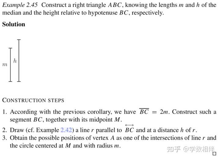 证明: 直角三角形作直角顶点关于斜边中点的对称点,我们得到矩形,结论立得。 # 命题2.46: 平行四边形为菱形(rhombus)当且仅当它的对角线互相垂直。 证明: 菱形四条边相等,可以由 SSS 得到全等,于是得到关于对角线所得到的四个角相等,因此都是 90^\circ 。 反过来,如果平行四边形 EFGH 对角线互相垂直,又因为平行四边形对角线互相平分,那么对角线既是高线又是中线。我们很容易得到邻边相等的结论,于是就得到这种平行四边形是菱形。 33. 正方形(square) 最后再看看正方形,一种特殊的凸四边形,它同时是矩形和菱形。因此正方形具有相等的边和内角,另外它对角线也相等且垂直,交于中点,并且与正方形的边成 45^\circ 角。 备注2.47: 梯形(trapezoids) \mathcal{T} , 平行四边形(parallelograms) \mathcal{P} , 矩形(rectangles) \mathcal{R}, 矩形(rhombuses) \mathcal{L}, 正方形(rhombuses) \mathcal{Q}, 那么就有下面的关系: \mathcal{R} \bigcup \mathcal{L} \subset \mathcal{P} \subset \mathcal{T}\\ \mathcal{R}\bigcap \mathcal{L} = \mathcal{Q}\\ 这里包含关系都是严格包含。 14. 尺规作图1.1 线段长度比较 |