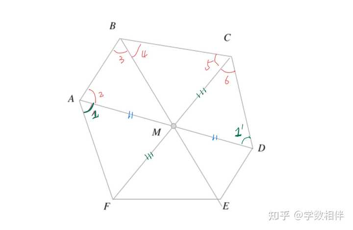 说明: D, A 重合, \overleftrightarrow{EF}\parallel \overleftrightarrow{BC} , 如果满足 \overline{DE} = \overline{EF} = \overline{FA} 则只能为等边三角形。 20) (TT) ABCDEF 是凸六边形,它的对角线 AD,BE,CF 交于一点 M 。如果 M 是这三条对角线的中点,证明 \widehat{A} + \widehat{B} + \widehat{C} = 360^\circ 。(原书结论有误 180^\circ ) |
