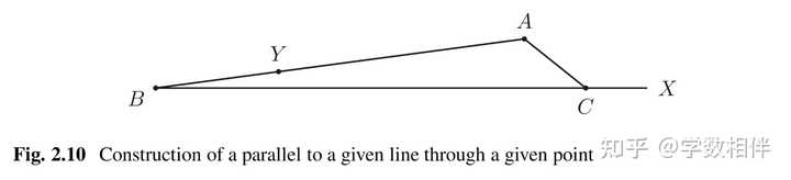 例2.16: 通过点 A 绘制一条直线 s 平行于给定直线 r ,其中 A\not\in r 。 取 r 直线上两个点 C,X ,并连接 AC 。构建角 \angle CAY 使得 \widehat{CAY} = \widehat{ACX} , 其中 X,Y 是关于直线 \overleftrightarrow{AC} 相反的半平面内的。设 s=\overleftrightarrow{AY} 就平行于直线 r 。 |