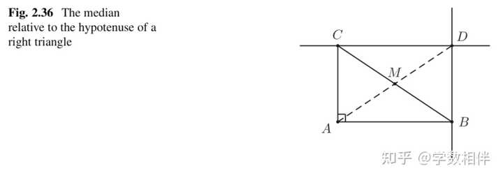 证明: 若 ABCD 为矩形,则四个角均为 90^\circ ,另外矩形也是平行四边形,因此对边相等,根据 SAS 可证全等 \Delta ABD\cong \Delta CDB ,得到对角线相等 \overline{AC} = \overline{BD} 。 反过来,如果对角线相等,平行四边形对边相等,由 SSS 可证得全等,于是平行四边形对角相等,而对角互补,立即得到四个角均为 90^\circ ,于是得证平行四边形为矩形。 # 推论2.44: 直角三角形斜边中线长度为斜边的一半。 |