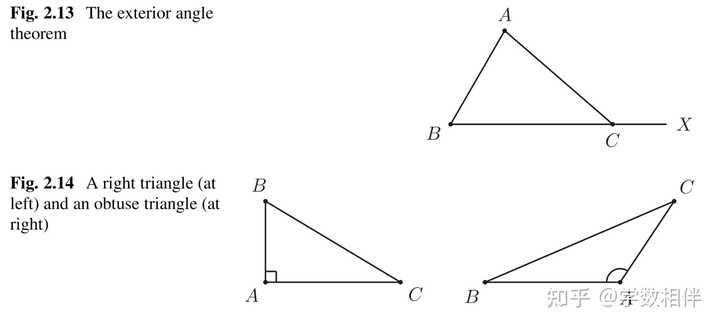 定理2.19: 三角形内角和为 180^\circ 。 只需要过其中一点作对边的平行线即可利用推论2.18得到该结论。 推论2.20: 等边三角形的每个内角为 60^\circ 。 推论2.21(外角定理exterior angle theorem): 三角形中,任意一个角对应的外角等于另外两个不相邻的内角之和。 |