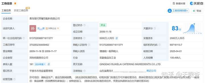 天眼查工商信息显示,【青岛瑞可莱餐饮配料有限公司】成立于2009年,法定代表人为孙某刚,经营范围包括调味品生产、食品互联网销售等。 股东信息显示,【青岛瑞可莱餐饮配料有限公司】由【青岛财生禾管理咨询有限公司】、孙某刚、高某共同持股。 |