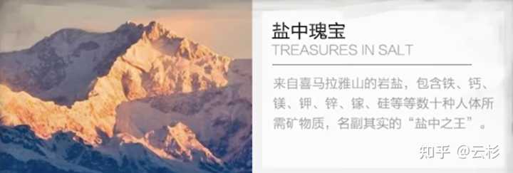 49块380g,是普通食盐的十倍以上了。 这名字,很难不让人联想到高耸连绵的喜马拉雅山脉,如梦似幻的粉红色盐矿。 有些产品的宣传是这样的: |