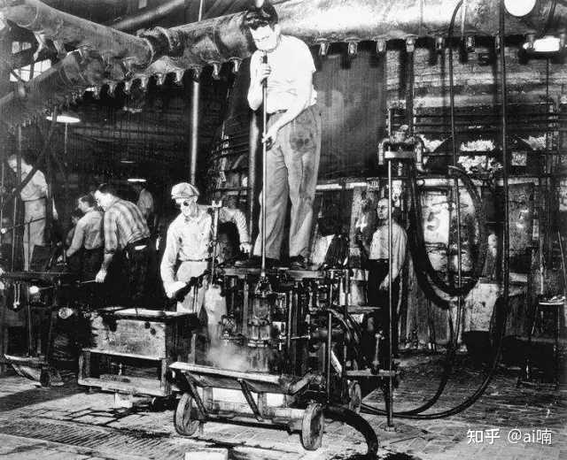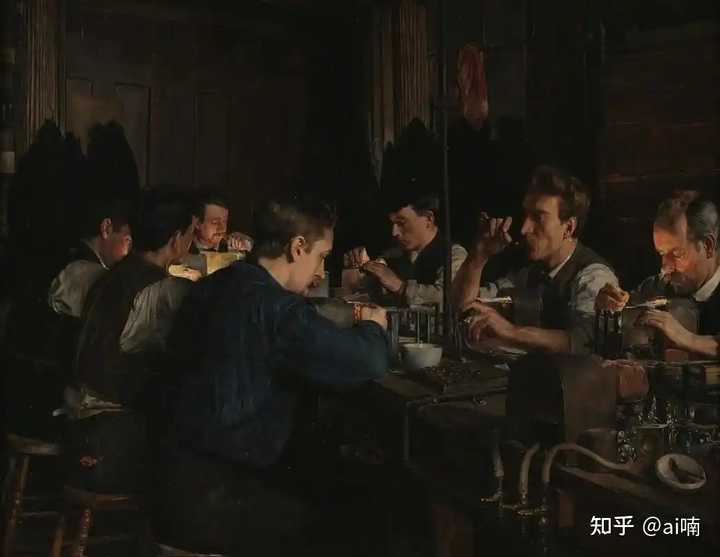 《吹玻璃工》(查尔斯·弗雷德里克·乌尔里希) 据《玻璃的故事》一书中所说,一直到1828年一个肺功能略差的吹玻璃工罗宾涅才最先发明出靠脚驱动的泵筒,从而将一些玻璃工人从繁重的吹玻璃工作中解放出来,但还是因为气流稳定性等原因制作出的玻璃制品品质依然略低于人吹出来的,加之虽然不增加吹玻璃工肺的负担,但来回的腿部运动也够玻璃工受得了,因此没能大规模推广,直到1903年欧文斯制瓶机的出现才彻底将吹玻璃工从这一伤身的工作中解放了出来,据其发明者迈克尔·约瑟夫·欧文斯声称,最开始他希望能把数以万计的玻璃工从这繁重而痛苦的工作中解救出来,最终这款不再需要人的全自动玻璃瓶制造机,在当时成功向社会输出了无数熟练的吹玻璃工人,可以说是在工业化浪潮中时代阵痛的最典型写照,但从另一个角度来说至少从此之后世界不再像之前那样需要那么多人承担这份痛苦了。 |