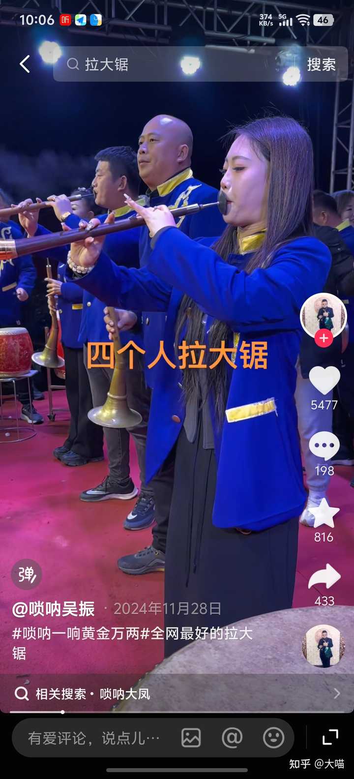 和吹唢呐,还有吹小号单簧管萨克斯的一样,都是不科学的发力导致的。 应该由胸腔横膈肌扩张收缩发力的,不用腮帮子发力。当然两腮以及颈部也可以参与进来增加一些特色风格,但是核心始终是腹腔胸腔横膈肌。 看这个吹唢呐的男子。 |