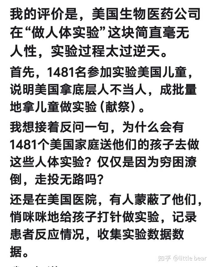 什么叫孩子被打针了哭了就绑起来不让他乱动, 什么叫父母为什么不管,因为父母在其他房间试药 什么叫为什么父母不能一起陪护,因为放一起孩子太惨父母会带着孩子半路跑了 什么叫白人小孩胳膊上全是针孔,甚至得了血管炎 只能说闹钟人还是太纯良了,这些字都认识,组合在一起怎么就这么让人难以接受呢 |