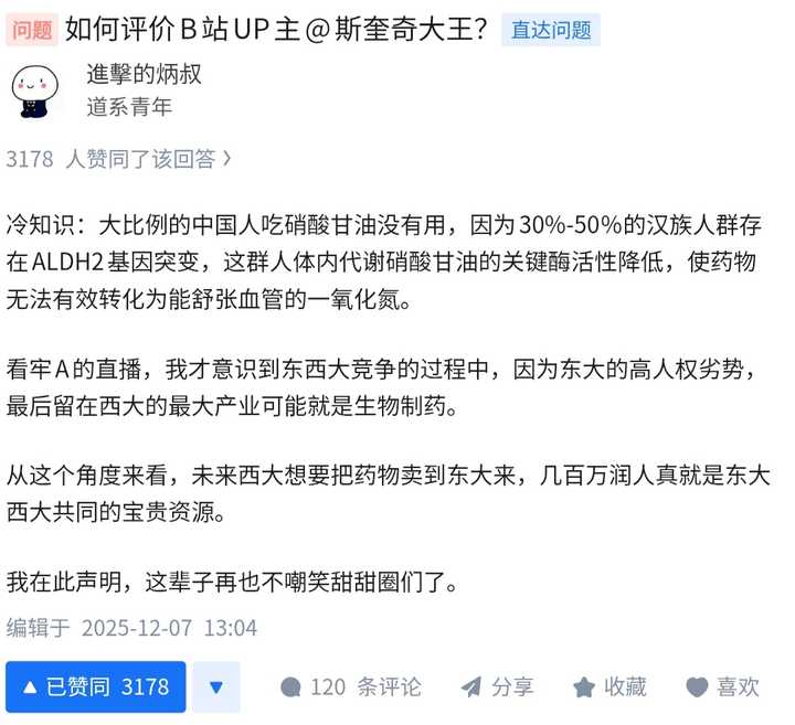 今天刚在知乎刷到一个回答,答主去医院,医生给他开药,说进口药贵但是临床经验多,国产药便宜但是临床经验少一点,效果都是差不多的问他要哪一种,答主就说我肯定选国产啊,然后他的评论区纷纷笑话他省钱选国产药 我就在最高赞嘲讽答主的评论下面回复了一条:以前我也觉得药都差不多,但是看了牢A之后我觉得还是选进口药吧,人家是真拿高达做实验啊,我们估计很难赶得上了。然后我发完这条评论底下人纷纷回复我告诉我什么领导批文才是关键,什么我们有12亿人口(????)随遍找人做实验很快就能赶得上,还有更多人发完评论就把我拉黑了,关键是他们的评论直接被知乎删除了我啥也没看见,所以为什么跟他们一样夸进口药好他们反而急了呢,不会是习惯地看见洋玩意就吹,被我提醒之后才想起来临床经验多可能并不代表是好事吧 |