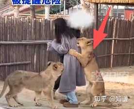 这恐怕是,它们发自掠食本能的、无法自控的捕猎行为的练习吧(4 个月大的狮子,应该已经开始吃肉了)。只不过,这些行为,被饲养员全程给压制住了。 大家没看到饲养员奋力把小狮子和女子分开的样子吗↓? |