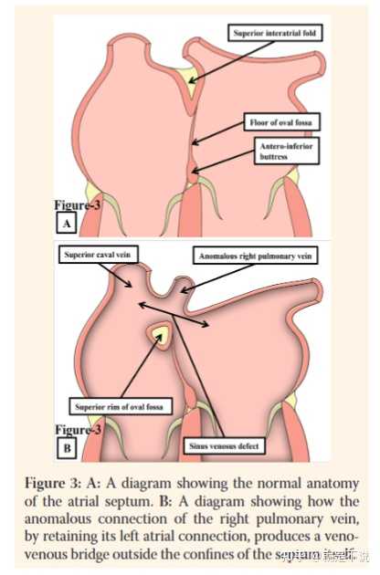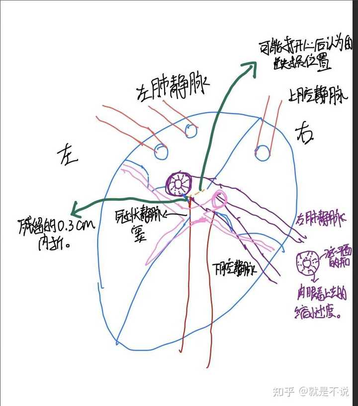 上腔静脉窦型房间隔缺损形成静脉–静脉桥的情况,做一个示意,如果有单干的话视觉上可能就会把静脉桥距离拉远了,就像是正常的下壁了 |