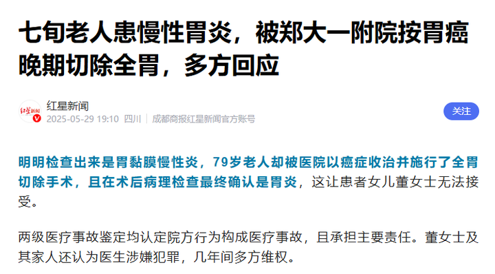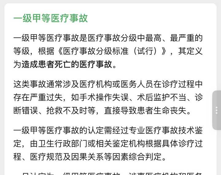 它的定义是,医疗机构及其医务人员,在医疗活动中,违反医疗卫生管理法律、等各种规范,过失造成患者死亡。所以事件的定性就是,医方有过失,造成患者死亡。 这里我拿两个例子对比一下,第一个是宇宙附院,去年,给一个胃炎患者切了全胃,这个指正并不明确,而且患者高龄,风险大,确实有过失,但是患者除了器官切除本身的影响外,没有其他并发症,所以最后的定性,是一个二级丙等医疗事故https://news.qq.com/rain/a/20250619A03WMG00" data-tooltip-richtext="1" data-tooltip-preset="white" data-tooltip-classname="ztext-reference-tooltip">[1]。 |