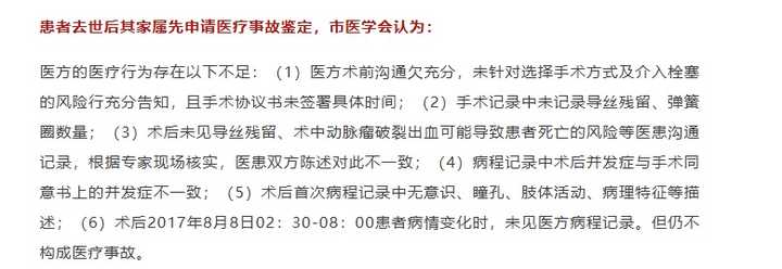 再说一个比较冷门的,一个患者颅内动脉瘤破裂,然后再医院治疗术后死亡,虽然患者死亡了,但当时的鉴定委员会认为,死亡原因为疾病本身所致https://mp.weixin.qq.com/s?__biz=MzU2NDY1NTU5OA==&mid=2247493351&idx=1&sn=64ef10c4a5a16d171c40ac189c841087&chksm=fc450266cb328b706079e0ca6dbb04f836837f8332e919dd6e3103f87e62d65ec514f0ac911a&scene=27" data-tooltip-richtext="1" data-tooltip-preset="white" data-tooltip-classname="ztext-reference-tooltip">[2]所以不构成医疗事故。 |
