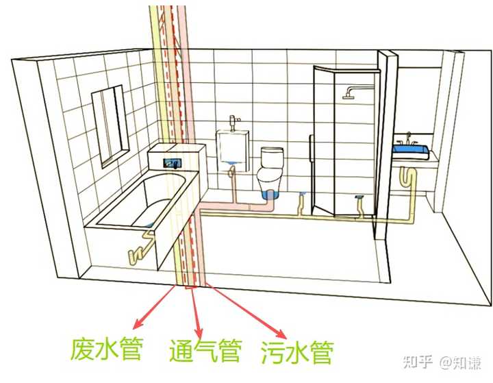 废水管、通气管、污水管与室内管道连接示意图其中: 废水管收集住户家里淋浴间、盥洗池、厨房等处的生活废水,直接进入城市污水管网,最后进入城市污水处理厂; 污水管收集住户家里马桶、蹲便器等处的粪尿污水,大部分会先进入小区的化粪池,然后从化粪池流出发酵后的上清液,再进入城市污水管网,最后进入城市污水处理厂(小部分会直接进入城市污水管网); 通气管并不收集废水,主要是一端连接污水管、废水管,一端连接大气环境,起到平衡气压和排气的作用。 |