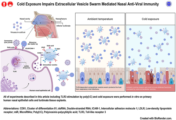 寒潮 (A) 总体影响和 (B) 寒潮叠加影响导致的流感发病率相对风险 这意味着什么?意味着在季节交替、冷空气突然南下时,感染风险并不是线性变化,而是会在短时间内抬高。 “春捂”在这样的背景下,其实是在帮身体跨过温度波动的风险窗口。 二、冷空气对鼻腔防线的直接影响:免疫不是恒定的 有人会问:冷一点真的会“着凉”吗?病毒不是靠传染源传播吗? 传播固然重要,但宿主的防御能力同样关键。2023年《Journal of Allergy and Clinical Immunology》的一项基础研究给出了机制层面的证据[4]。研究者发现,当鼻腔暴露在较低环境温度下时,鼻上皮细胞分泌的胞外囊泡数量下降,这些囊泡本身具有中和病毒、传递抗病毒微小RNA的功能。冷暴露会降低囊泡分泌量、减少抗病毒成分的装载,并削弱其与病毒结合的能力。 |