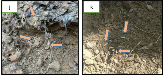 土壤中发现的蛆虫 第四周 此时进入后期分解期,尸体大部分软组织已分解殆尽,腐败气体产生量锐减,气味也不再那么刺激,凑近后仅可闻到腐腥味。 这阶段坟墓表面仍旧会吸引不少苍蝇,土壤以及尸体除了有蛆虫之外,还出现不少蛆茧。 |