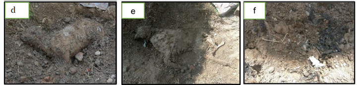 d尸体肿胀阶段 e尸体干瘪 f尸体快速分解 第三周 此时尸体腹部塌陷,软组织进入快速分解期, 大量硫化氢、甲硫醇、腐胺、尸胺等腐败气体持续产生,同时腐败液渗透土壤,壤土的吸附和阻隔达到饱和,大量腐败气体快速逸出地表。 这个阶段的臭味最为明显,凑近时会有刺鼻、恶心的感觉。 在腐尸腹部塌陷处附近出现大量南非阳蝇(Hydrotaea capensis)二龄幼虫,裸芒综蝇(Synthesiomyia nudiseta)三龄幼虫, 同时蛆虫也吸引不少四斑阎甲、亮阎甲以及行军蚁出现。 |