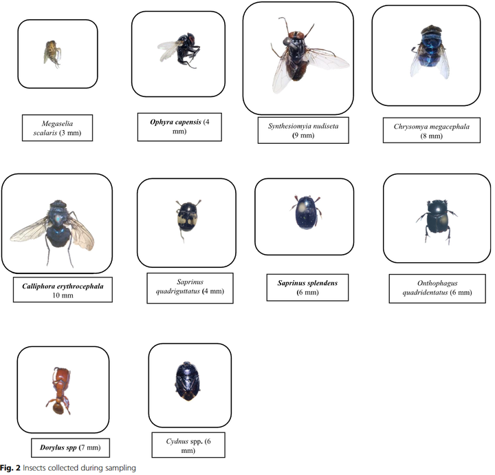 a受害羊 b埋之前。c埋好了 由于印度不管是降水还是温度都远高于我国大部分地区, 我们可以参考一下会发生什么事。 第一周 此时正处于新鲜期,土壤基本阻隔了尸体本身的微弱异味,普通人很难观察到端倪。 坟墓周围出现斯氏蚤蝇(Megaselia scalaris)四齿嗡蜣螂(Onthophagous quadridentatus)和土蝽(Cydnus sp. )由于尸体还在地下,昆虫大军主要在墓穴表面爬行, 只有斯氏蚤蝇凭借微小的体型(成虫约2–4 毫米)出现在尸体背部。 第二周。 此时尸体进入膨胀期,微生物分解开始大规模进行,此时土壤还能压住臭味不朝远处扩散,仅靠近可闻到淡淡的臭味,远离后异味立即消失。 但是腐臭味已经吸引大头金蝇(Chrysomya megacephala)反吐丽蝇(Calliphora vicina) 四斑阎甲(Saprinus quadriguttatus)等昆虫在坟墓表面聚集。 丽蝇(俗称绿豆蝇,身上有金属光泽)麻蝇(俗称大苍蝇)等个头比较大的蝇类都极度喜爱腐尸,如果在某地发现大苍蝇大量聚集停留,极有可能附近有腐尸存在。 这两类也是推断死亡时间(PMI)最核心,最常用的昆虫。 |