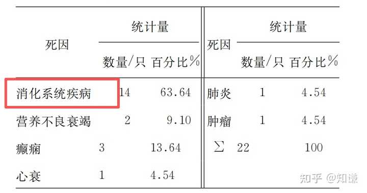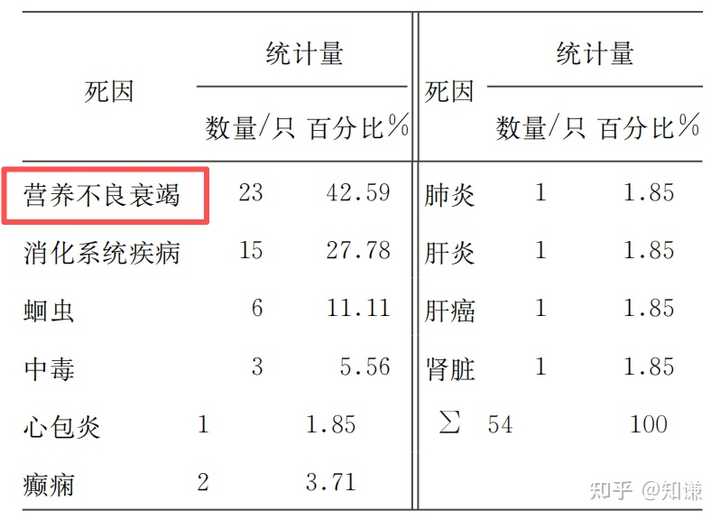 大熊猫的死亡,野生多数是营养不良,圈养多数因消化道疾病,总体死因也是消化道问题占大头。要说什么消化道疾病最要命,肠系膜扭转、肠梗阻绝对坐得上头几把交椅,不马上手术,死亡率很高。 半半、香果均不幸死于这两种肠道急症,就是例证。有一篇古早文献[1]分析了 76 例大熊猫疾病死亡原因,结果发现: 54 只野生大熊猫中,死亡的首因是营养不良↓ |