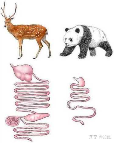 大熊猫肠道和食草目动物对比 其消化道尤其短,只有体长的 4-6 倍[3]。而真正食草目动物的肠道能有体长的十几二十倍。 比如,鹿的肠道是体长的 15 倍,羊的肠道达到了体长的 25 倍[4]。 而且,大熊猫的消化道不但短,肠道内消化纤维素的酶和细菌还很少[5]。这会造成什么影响呢? 大家看看这个↓,大熊猫的主要食物(竹叶、竹杆、竹笋)中主要成分就是难消化的纤维素。 |