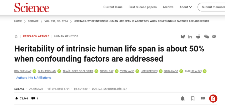 先说结论:从一个长寿老人的生活习惯里找“秘诀”,在科学上几乎没有意义。 因为这叫幸存者偏差。 比如有100个人从年轻时就爱吃肉、爱喝酒、睡眠特别多。过了几十年,可能只有一两个人活到100岁。记者去采访这一两位幸运儿,问“您长寿的秘诀是什么?” 回答自然是“吃肉喝酒多睡觉”。但那98个做了同样事情却没能活到100岁的人呢?他们已经不在了,没人去采访他们。你只看到了活下来的那个样本,忽略了大量没活下来的。 那科学的做法是什么? 是跟踪一大群人,从年轻时开始记录他们的基因和生活方式,然后看几十年后谁活得更久。 这才能给你答案。巧了,真的有很多科学家已经做了很多相关的研究,我们一起来看看。 关于基因对寿命的影响,科学界争论了很多年。过去的主流认为基因对寿命的影响大约占25%。 这个数字来自丹麦、瑞典等地的双胞胎研究——比较同卵双胞胎和异卵双胞胎的寿命相关性,从而估算出遗传因素的“贡献值” 还有一些大规模家谱研究认为这个数字可能低至6%到7%。 如果25%是真的,那基因的作用其实很有限,我们的生活方式才是大头。 因此很多年来,大家也是这么理解的。 但2025年1月,一篇发在《Science》上的论文改变了这个观点。[1] 这篇论文的故事本身就很有意思。 魏茨曼科学研究所的Shenhar和同事们,原本并不是在研究寿命的遗传率。他们在用数学模型分析人群中的衰老差异。 有一天Shenhar在调整模型参数时,发现一个奇怪的现象: 当他把“外因死亡”——也就是事故、感染、凶杀这些外部因素导致的死亡从数据中去掉之后,寿命的遗传率突然上升了。 |