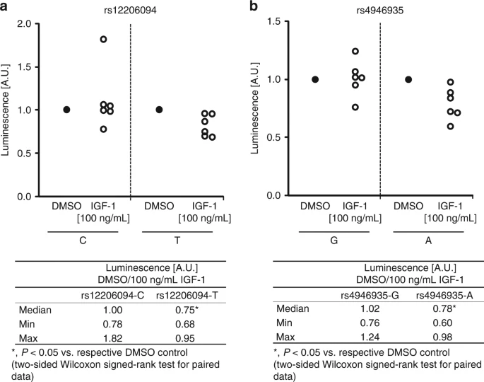 2017年,德国基尔大学的Flachsbart团队做了更进一步的工作:他们对FOXO3基因座做了精细定位,找到了两个最可能的功能性变体(rs12206094和rs4946935)。 通过荧光素酶报告实验,他们证明这两个长寿等位基因具有明显的增强子活性,而且这种活性会被IGF-1信号抑制。 |