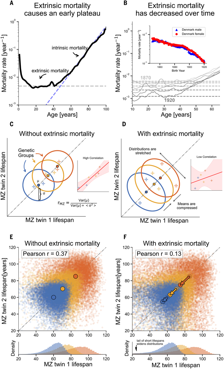 这让他觉得不对。 他发现过去几十年所有的寿命遗传率研究,都没有区分“内因死亡”和“外因死亡”。 一个人被车撞死了,这跟他的基因有什么关系? 但在过去的统计里,这类死亡都被混在一起计算,自然会把遗传率拉低。 为了验证这个想法,他们找来了一组非常珍贵的数据——瑞典的双胞胎收养研究。这个数据库里有从小被分开抚养的同卵双胞胎——基因完全一样,但成长环境不同。 这几乎是人类能做到的最接近“自然实验”的条件。他们又用丹麦和美国的双胞胎数据做了验证。 结果是:当校正了外因死亡的干扰后,人类寿命的内在遗传率超过50%。 |