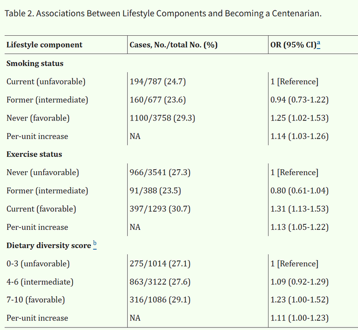 这跟衰老研究中一个经典的发现对上了: 降低胰岛素/IGF-1信号通路的活性,在从线虫到小鼠的多种模型生物中都能延长寿命。 FOXO3的长寿变体,本质上就是让这个基因表达得更多、活性更强。 但接下来的发现就有点出乎意料了。 2017年,波士顿塔夫茨大学的Sebastiani团队联合了四个独立的百岁老人研究,用统一的标准重新分析了FOXO3跟极端长寿的关系。[5] 他们确认了FOXO3跟长寿之间的关联 但同时发现:FOXO3的保护效应在更极端的年龄段反而减弱了。 也就是说,它可能帮你活到95岁、100岁,但对于活到105岁、110岁,它的贡献就不那么确定了。 讲完基因,我们回到生活方式。 有人可能会想:基因占了50%甚至以上,那基因不好是不是就认命了? 不是这样的。 看看一项前年发表的针对我国国人的大规模研究[6]。这项研究用的是“中国老年健康影响因素跟踪调查”的数据。 研究者从中选出了5222位80岁以上的老人,其中1454人后来活到了100岁。 他们根据三个指标——吸烟状况、运动习惯和饮食多样性,给每个人打了一个“百岁健康生活方式评分”。 结果发现:评分最高那组活到100岁的几率是最低组的1.61倍。 也就是说,不吸烟、保持运动、饮食多样化,每一个因素都跟更高的百岁概率显著相关。 注意这些人已经80多岁了。能活到80岁,基因已经筛选了一轮,大家的底子不会太差。 但即便如此,生活方式仍然能拉开差距。 |