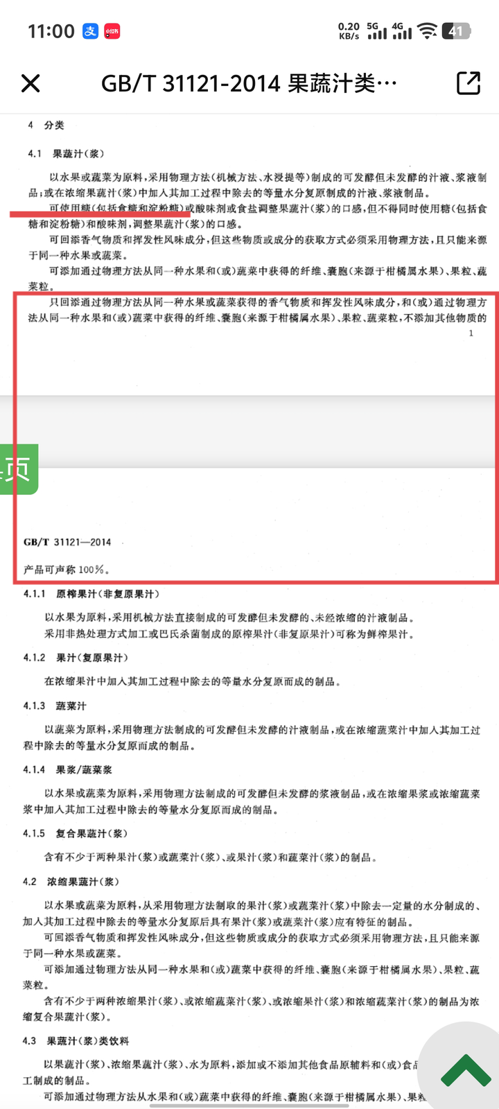 我查了下GB/T 31121-2014《果蔬汁类及其饮料》,甚至里面还说中说了加了糖也可以叫果蔬汁,如果只加风味剂或者物理方法获取的纤维等还可以叫100%果蔬汁。 经过 @钱程 老师提醒,此处有修正 100%果汁的定义,是浓缩果汁加适量水(做浓缩果汁时去除多少水就只加多少水,水加多了 要归到果汁饮料的范畴)比如汇源果汁宣传的一升七个苹果。 同时不能添加糖、酸味剂、食用盐等,但是可以加果肉,风味提取物等原蔬果上提取的一些丰富口味的东西。 |