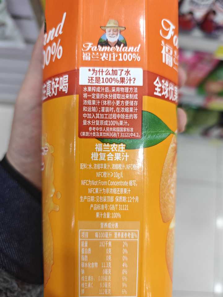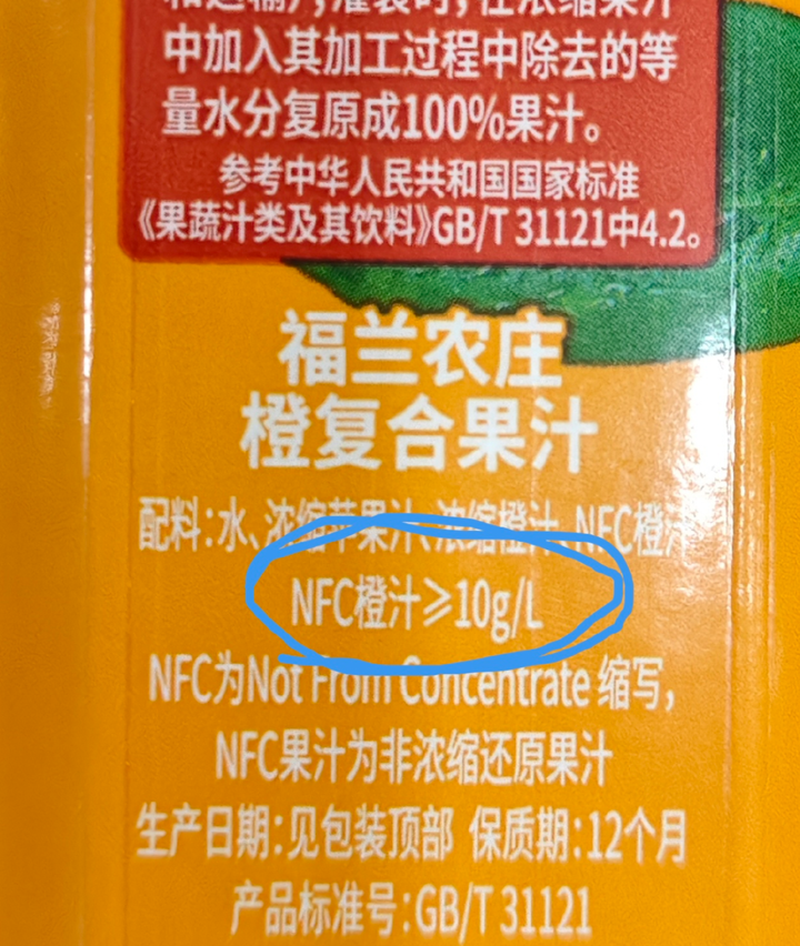 但是很明显,它的“科普”和产品关系不大,浓缩果汁加适量水,是可以叫100%果汁,但是它打起了nfc的主意。 由于nfc没在国标有体现,商家肆无忌惮的标nfc,然后配料表里说nfc不低于10g/L,这不就是1%左右吗?这也能叫nfc+了,我当时就震惊。 |