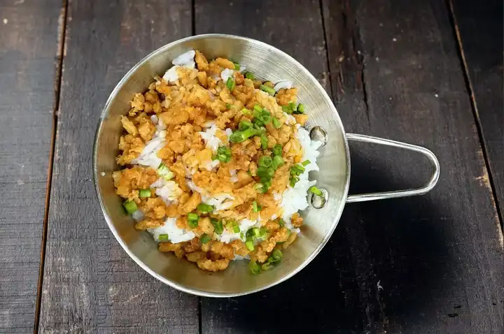 小时候那会儿,有的时候我爸不在家,我妈糊弄饭啊,就会用猪肥膘熬点油渣~米饭上放上切好的葱花,再加点白砂糖,用这个熬热的油渣连同猪油直接往上一淋~ 刺啦一声~香味儿一下就激出来了!再倒点酱油,就这么拌着吃!看似简单,实则特别解馋~ |