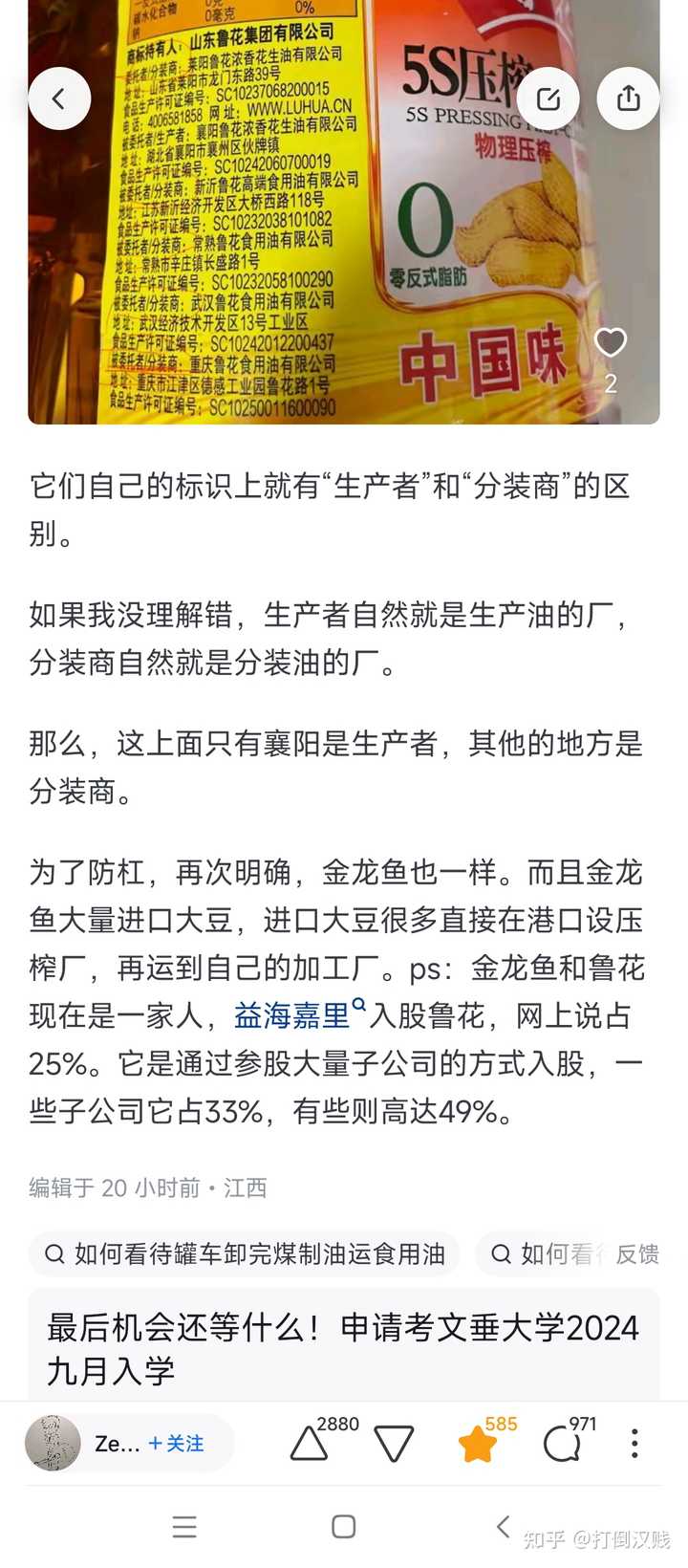 给你们这群健忘症科普一下,24年曝光了一件事,运油车用运柴油,化工废水的车运大豆油,几乎无品牌幸免,因为他们都用第三方公司的车运油。不过后来轻轻放下,就说只有那几辆车有问题,然后说外国油有问题,中国国产油没有问题,但是鲁花曝光了他自己没有运油车,就是用第三方公司的。 |