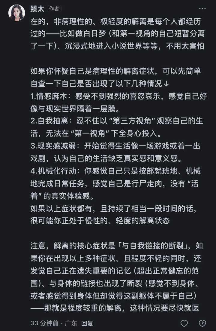 在咨询师看来不容乐观…毕竟客观来看,「爱你老己明天见」横空出世的大背景,是一连几年的经济大环境不景气、就业率低迷和全民身心亚健康困境持续加重…… 这么说吧,如果这个口号是在2012~2018那波经济上行期得以迅速风靡,那么我们尚可以在社会学意义上将这个梗的流行当成年轻人自爱意识的一次大唤醒、年轻人关于「自爱」的一次纯粹的集体大呼吁 但很不妙,这个梗出现在2020年之后的第五年…… 从伴随该梗的一系列热闹声势来看,「爱你老己明天见」的热门视频有两类 一类是着重于感谢自己对自己的物质给予,包括自己给自己吃了什么、自己给自己买了什么,结尾的主题升华是“最舍得给我花钱的人出现了!就是老己【流泪猫猫头.jgp】!感谢老己!爱你老己明天见!” 第二类是着重于感谢自己对自己的精神支持,包括每次难过时自己对自己的陪伴、自己救自己离开泥潭,结尾的主题升华是“我是对自己最真心实意的人、只有我会无数次救自己于水火之中!所以,感谢老己!爱你老己明天见!” 而随着该梗的迅速风靡,第一类视频已经有商家开始着手植入自家软广了,文案大致是“对自己好不是买一个奢侈大牌包、一双折磨你脚底的高跟鞋,而是在深冬请自己喝一杯热奶茶,周末犒劳自己吃一顿炸鸡,为自己买一份更好的xxx(某种轻消费品)” 打着反消费主义的旗号,把「自爱」和自家商品进行一波软性的概念绑定 在人均消费大降级?消费市场空前遇冷的双杀大背景下,「爱你老己明天见」一梗应该是目前最让各大商家市场营销部感到摩拳擦掌、蠢蠢欲动的流行梗了…至于他们要如何大显身,接下来我们就拭目以待吧…… 在年轻人不堪重负的大背景下,此梗的迅速流行,非但有可能不是年轻人与自己的大和解,还有可能象征着一次大环境不景气下的集体心理健康的滑坡…… 因为就目前来看,这个梗下的两类热门视频,一类着重于表达自己是唯一舍得给自己花钱的人,另一类则在于感谢自己是「唯一能在困境中对自己不离不弃、为奋力拯救自己的人」 看出来什么了吗?敏锐的朋友应该能嗅出来了——社交原子化,缺乏来自亲人朋友的相互支持 我们的年轻人为什么这么大面积地且公开地讴歌和感恩「老己」——因为ta身后空无一人,ta下坠的时候,身下是没有一张由家人、朋友交织而成的社交网络能托住ta的 所以像现在这样,我们看到年轻一代在经历了几年的经济大遇冷后,突然大面积地讴歌和感恩「老己」,我们就应该意识到——过去这几年里,年轻人的生活真的非常不好过。在艰难前行的路上,在被迫加班、单休和极低的薪资下,他们中的相当一部分人,实际上已没有了高质量的社交,进而活成一座孤岛,活出了只有自己能给予自己精神支持的境地…… 还好玩吗?作为咨询师,我看着真是笑不出来的。 另外,「爱你老己明天见」这句,在心理学视角下,其实有股子近似于「人格解离」的异味的… 这里简单快速科普一下「解离」 解离的核心本质:与自我和现实的连接断裂 解离的核心是 “断裂” ,主要表现在以下几个方面的连接断裂: 1.与自我的断裂:感觉不像自己,不认识镜子里的自己。 2. 与记忆的断裂:重要的个人记忆消失或变得不像是自己的。 3. 与意识的断裂:感觉意识模糊,像在做梦或隔着雾看世界。 4. 与身体的断裂:感觉不到身体或感觉身体不属于自己。 5. 与现实的断裂:感觉周围世界不真实。 现在我们一起回到「爱你老己明天见」这句梗,上面我也说了,这个梗出生的大背景很糟——在一个有长期的慢性压力?年轻人人均焦虑值爆表的社会下,这样子的社会环境下,这一代年轻人有很高的风险出现心理异常 结合上面的解离概念,敏锐点的朋友应该能嗅出来了这梗本身自带的某种异样味道了——它近似于某种非急性的、症状较轻的解离状态 再结合这个梗的两类热点视频,你就能看到一场集体的、大型的自我抽离现场——大量缺乏原生家庭的物质支持、没有社交网络的情感托底的年轻人们,经历了疫情?后疫情时代、就业率暴跌?经济大寒冬的轮番轰炸,在咬牙苦捱几年却越活越孤独后,在这样一个冬天,大量的年轻人突然像是脑子联上同一片局域网一样,集体把自己抽离出第一视角,以第三方视角看待、讴歌与感恩自己 年轻一代重写了自己的生活剧本,从「一路走来身后空无一人」到「我就是我自己最好的朋友」,我们当然可以说这是具有积极心理意义的(心理治疗的重点之一,就是帮助来访者重构个人叙事),但结合这几年的社会大背景,我感觉这是年轻人在通过重构个人叙事,来与残酷的社会现实、自身的孤独境遇达成某种情感隔离 大家通过聚焦第三视角下的自己——而非不给自己物质支持的原生家庭父母、不给自己情感支撑的朋友——来重构个人叙事,以此来切断自己与过往痛苦现实的深度链接,这本质上已经近似于一场集体性解离的大型发作/狂欢现场了… 就这么说吧,这个社会上有一小撮这样倒霉的年轻人不足为奇,天将降大任于斯人也必先苦其心志不是么?但是当成批成批的年轻人这么惨,事情就很不对劲了…… 当年轻人普遍性地缺乏原生家庭的物质支持、无法得到来自朋友的精神支持(甚至因为竞争激烈、举报文化盛行而要提防同龄人背刺),又在经历了疫情时代?经济下滑的后疫情时代后,突然集体开始「爱你老己明天见」,在我看来这真是