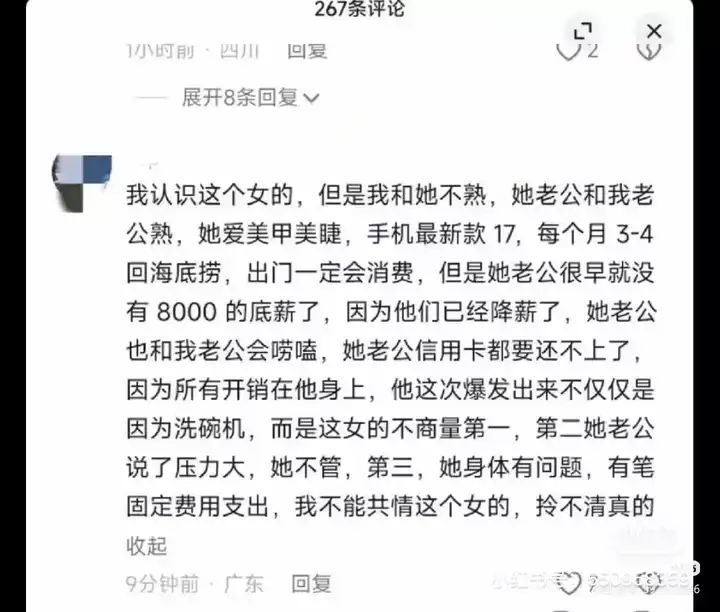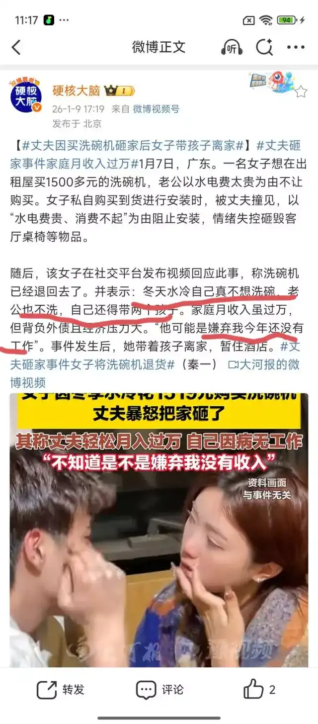 洗碗机女主,翻车翻得一点不冤。 视频里拍得挺好看: 老婆花 1519 买洗碗机, 老公不同意, 情绪崩了把客厅砸了。 网友一看就炸了: 冬天水冷成这样, 老婆买个洗碗机都不行? 这男的还是人吗? 结果今天细节一扒, 才发现 不是洗碗机的问题,是这家本来就快散架了。 先说硬条件: 家里 欠20万。 女的身体不好,常年养病, 不是偶尔花钱,是月月出血。 租房住, 房租 2000, 雷打不动先扣。 四口人吃喝拉撒, 一个月 3000? 说句难听的, 这已经是勒着脖子过日子了。 男的做销售, 至少两个电话。 女的三个电话。 一个月 300, 这还没算流量乱超的。 水电费 300 起步, 夏天空调一开, 账单直接跳脸。 车呢? 停车、保险、保养、油电, 你敢说 1000 不算保守? 俩孩子, 不管上不上学, 吃喝穿用, 500 都是瞎算的最低线。 一通账算完你再看洗碗机。 这男的一个月那点工资, 基本是 刚到账就见底, 站都站不稳。 更扎心的是: 这 1万块 你还不知道是税前, 还是税后。 在这种家庭状态下, 买洗碗机不是“追求生活品质”, 是往漏水的船上再搬块石头。 不是说洗碗机没用, 是这个家, 根本没资格讲“非刚需”。 真要心疼老婆, 先装个热水器, 比洗碗机现实十倍。 所以别再被短视频带节奏了。 视频只拍情绪爽点, 不拍银行余额。 一个家真正崩的那一刻, 从来不是因为洗碗机, 而是穷到连选择权都没有。 敬请点赞,转发,关注。 送礼物 还没有人送礼物,鼓励一下作者吧 |