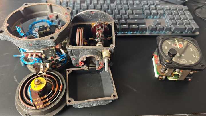 这是一个“高度-7”型航空气压高度表,是个巨大的铝合金圆柱体,采用真空鼓原理取得气压海拔值,有模拟信号输出能力。 它的核心部件长这样: |