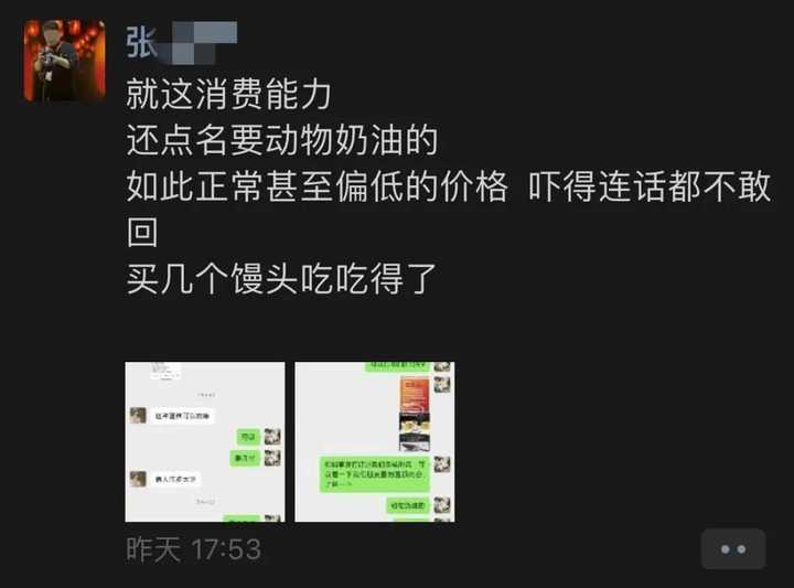 还配文称:“就这消费能力,还点名要动物奶油的。 如此正常甚至偏低的价格,吓得连话都不敢回,买几个馒头吃吃得了。” |