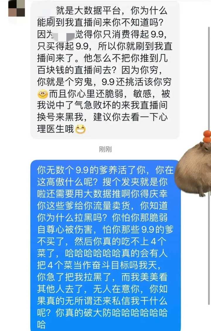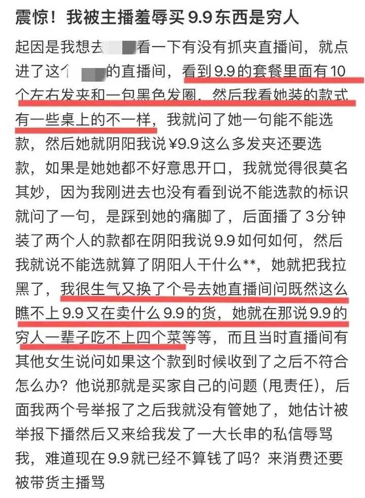 主播阴阳怪气地说:“9.9这么多发夹还要选款,如果是我都不好意思开口。” 发帖人就问她:“既然这么瞧不上9.9,又在卖什么9.9的货呢?” 主播尖酸刻薄地回怼:“所以你是9.9的穷人啊,9.9都买不起,是一辈子吃不上四个菜?” |