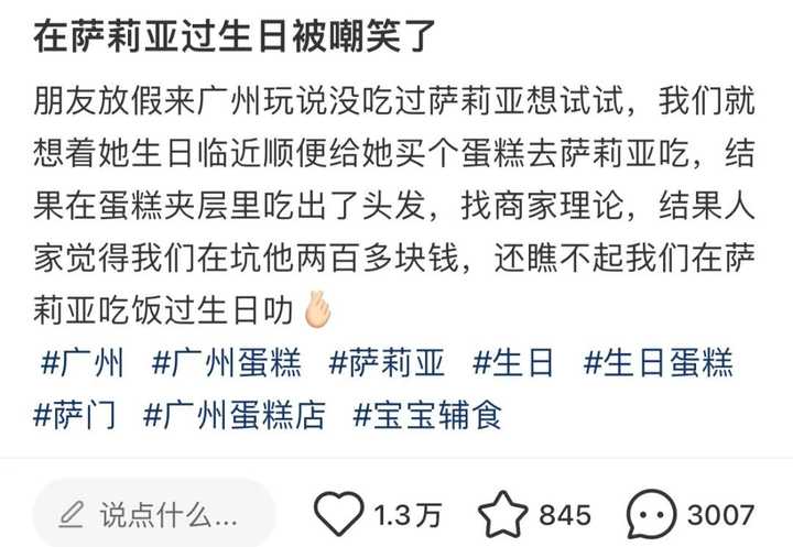 3500的毛衣对普通人来说就是很贵啊,不买就要被当着面明晃晃地羞辱,究竟是谁给你的优越感到底? 比如,有人找蛋糕店买了个私房蛋糕,和朋友一起拿去萨莉亚吃、过生日。 |