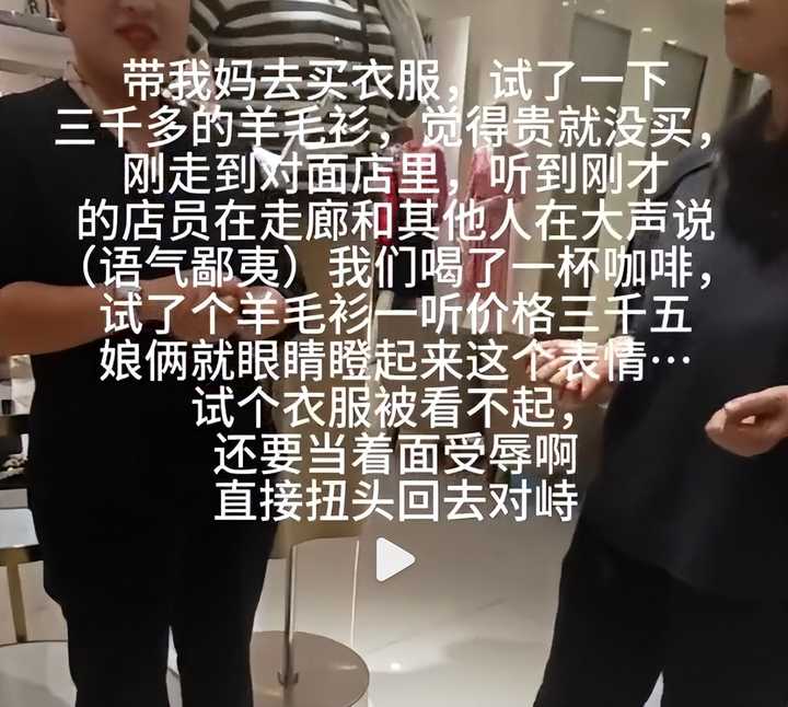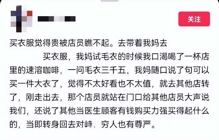 后来一问价格,被告知那件毛衣要三千五,妈妈嫌贵,说可以买一件大衣了,没准备买。 刚走出店门,那个店员就站在门口,和其他店员大声地吐槽了起来。 语气鄙夷地嘲讽他们喝咖啡、听到价格时的表情,还说其他当医生的顾客有钱购买力强买得起。 |
