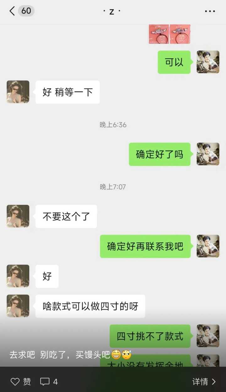老板直接高贵地回复说:“四寸挑不了款式,太小没有发挥余地。” 然后转头又发了条朋友圈,在背后蛐蛐顾客:“去球吧,别吃了,买馒头吧。” 而他恼怒的原因是:“跟了一下午,犹豫一下午,要四寸。” |